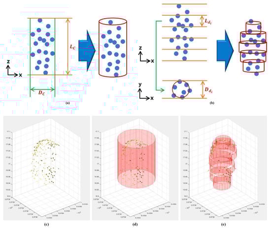 The volume of individual panicles was calculated using a 3D point cloud by two methods: (1) cylinder fitting and (2) disk stacking. Cylinder fitting involved using all the panicle points to calculate a cylinder volume from which the panicle length and diameter were estimated (Figure 3a). Multiple disk stacking was used to capture details of elongated ellipsoidal shape of the panicle (Figure 3b). Individual panicle points were vertically divided into multiple layers with a constant height () to select points within a prescribed disk. The diameter () of the disk, from top to bottom, was determined by fitting a circle to the selected disk points. When an insufficient number of points or point deployment resulted in an unreasonable disk diameter (too large or small), the previous disk diameter was used. All the disk volumes were summed to estimate the individual panicle volume.