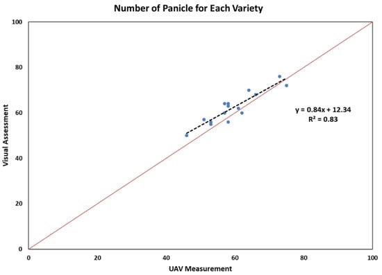 Relationships of panicle numbers by visual assessment and using the proposed method to detect individual sorghum panicles from the UAV image. The red line indicates the 1-to-1 line.