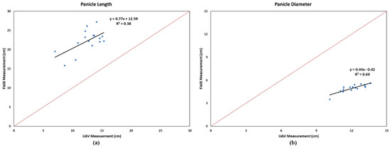 Relationships between field and UAV-based measurements of average panicle (a) length and (b) diameter in the selected varieties. The red line indicates the 1-to-1 line.