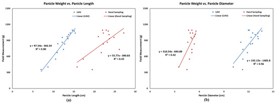 Relationships between yield versus average panicle (a) length and (b) diameter of selected varieties; field and UAV measurements are shown in red and blue, respectively.