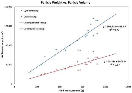 A linear regression model was employed to fit the ground-measured panicle weight to the total panicle volume obtained by cylinder fitting and disk stacking for each variety. The R2 value (0.77) for a linear fit of the data obtained using cylinder fitting was higher than that obtained using disk stacking (0.67) (Figure 7). The correlation coefficient between UAV and field measurements were also calculated as 0.88 and 0.82 for cylinder fitting and disk stacking, respectively. There was a very high relationship and correlation between the UAV-derived panicle volume and the field-measured panicle weight. Although cylinder fitting estimated an approximately two times larger panicle volume than that calculated using disk stacking, the panicle volume obtained using the proposed panicle methods were highly correlated with the field-measured panicle weight. If a sufficient 3D point cloud could be acquired from very-high-resolution images, the panicle weight could be estimated more efficiently without destructive sampling in the field.