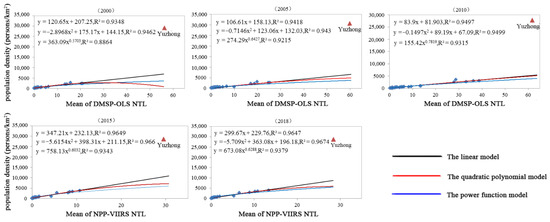 NTL mainly comes from household lighting, roads, urban lightscapes, all of which are closely related to human activities. Moreover, NTL intensity directly reflects the intensity of such activities. Figure 3 shows the relationships between population density and the mean value of NTL at the county level. In Chongqing, NTL intensity grew rapidly with growth population growth. The quadratic polynomial model had the highest coefficient of determination of all models tested including the linear model and the power function model.