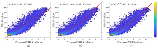 Correlation between the Defense Meteorological Satellite Program (DMSP) and processed Visible Infrared Imaging Radiometer Suite (VIIRS) values at the pixel scale for the (a) linear model, (b) quadratic polynomial model and (c) power function model.