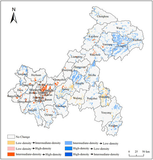 The total intermediate-density area decreased from 45.02 × 103 km2 in 2000 to 38.38 × 103 km2 in 2018 (a decrease of 14.75%). The reduced regions were mainly distributed in the primary urban zone of Chongqing and in the northeast. Intermediate-density regions in urban zone tended to agglomerate and gradually develop into high-density regions, while intermediate-density regions in the northeast gradually lost their population and developed into low-density regions. In addition, within each district and county, population development trended toward agglomeration, manifested as a gradual increase in urban population density and the gradual evolution of intermediate-density regions into high-density regions; however, in non-urban areas, population loss was more common in intermediate-density regions, where population density decreased.