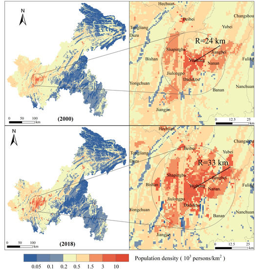 Changes in population density in Chongqing from 2000 to 2018.