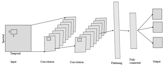 In Figure 2, an example architecture of the 2D CNN model, based on the spectral and temporal dimensions, is presented. It is a simple architecture with two hidden layers. In most CNN implementations, convolution is followed by other steps (not included in the figure) that help the model to generalize better, for example pooling and dropout. The figure does not propose a new architecture; it is instead used to show how the spectral and temporal dimensions are used in the input layer. The input image depicted in the figure is a single pixel converted to an image using its temporal and spectral dimensions. The size of the spectral dimension is six, whereas the size of the dimensions varies depending on the temporal interval used. The kernel of size three by three refers to length of three in both the temporal and the spectral dimensions. The pixel is then convolved consecutively depending on the number of the hidden layers. The final convolution is flattened, and a fully connected network is then applied. Finally, the SoftMax function converts the final output to probability values for each of the classes. A batch of such pixel images are fed into the model during training and prediction.