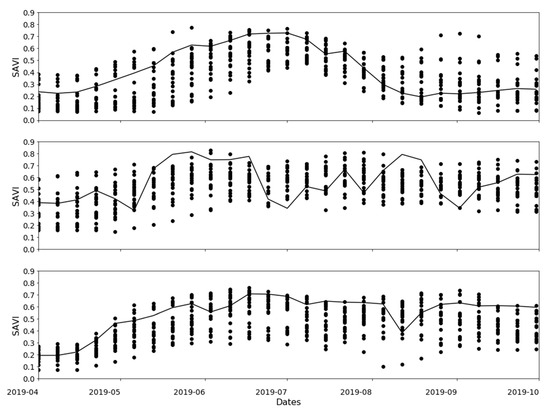 Figure 3. The temporal signatures of the Soil Adjusted Vegetation Index (SAVI) of the three land use classes, i.e., cereal (top), grass (middle) and unused (lower), as obtained from their respective typical pixels (dashed lines) and sample pixels (scattered plots).