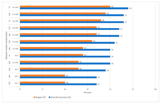 The accuracy measures of the test data for the twelve model–dataset combinations are presented in Figure 4. As can be seen from the figure in all accuracy measures, the 2D CNN model trained on the SITS data with a 7 days temporal interval performed best, with an overall accuracy of 94% and a Cohen’s Kappa of 90%. This is followed by 1D CNN, applied on the SITS data with 7 days temporal interval, and 2D CNN, applied on the SITS data with 14 days temporal interval, performing roughly equally. The worst accuracy was obtained when the MLP algorithm was applied on the SITS data with 28 days temporal interval. The values were obtained based on the optimized model applied on the held-out test datasets.