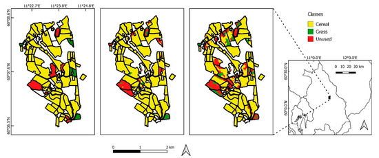 Three agricultural land use classes are defined, namely: (1) Cereal, representing areas used for cultivation of cereals such as wheat, barley, rye, and oat; (2) Grass, representing areas used for the cultivation of grass-based fodder; (3) Unused, representing agricultural areas without crops, i.e., temporarily or permanently abandoned with activities not qualifying for subsidies.