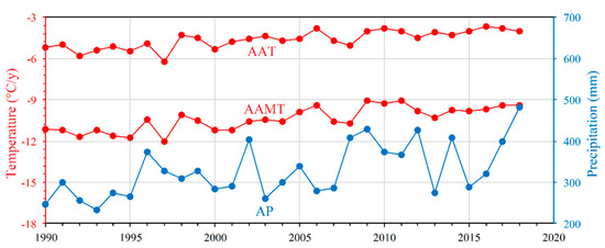As shown in Figure 2, AAT showed a significantly increasing trend (0.06 ± 0.01 °C/y, p < 0.01) with a noticeable variation. The average temperature was −4.6 °C during this full period. The average temperature was −5.0 °C during 1990−2005, and −4.1 °C during 2006–2018. The highest AAT occurred in 2016 with −3.7 °C, and the lowest temperature occurred in 1997 with −6.2 °C. AAMT also showed an increasing trend (0.08 ± 0.01 °C/y, p < 0.01), which was much faster than that AAT (Figure 2). The average AAMT was −10.4 °C during 1990−2018, −11 °C during 1990–2004 and −9.7 °C during 2005–2019. The lowest AAMT was −12 °C in 1997 and the highest was −9.1 °C in 2009 and 2011. As shown in Figure 2, precipitation showed a significantly increasing trend (4.6 ± 1.2 mm/y, p < 0.01) with fluctuation from 1990 to 2018. The average AP was 328.8 mm during this period. The average precipitation was 297.8 mm during 1990−2007 and 379.5 mm during 2008−2018. The highest precipitation occurred in 2018 with 480.6 mm, and the least precipitation was in 1993 with 232 mm.