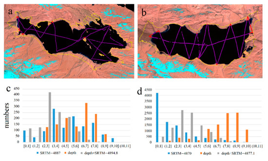 To keep the data in the same order of magnitude, subtract the minimum value from each set of data. The histogram of three cases for two lakes (the values of bathymetric depth, SRTM, and combined bathymetric depth and SRTM) is shown in Figure 3c,d. The value of SRTM and depth of HL distributed more evenly, and the value of SRTM and depth of LL distributed mainly in 4870–4871 m (0−1 m), and 7−9 m, respectively. As shown in Figure 3c, the values (SRTM + depth) of HL ranged from 0 to 8.5 which corresponds to 4894.8−4903.3, and approximately 80% of these values fell into 4896.8 m (2−2.5 m) to 4899.3 m (4−4.5 m). The values (SRTM + depth) of LL ranged from 4877 m (0−0.5 m) to 4886 (8.5−9 m), and approximately 60% of these values fell into 4878.6 m (1.5−2 m) to 4882.1 m (5−5.5 m) (Figure 3d). These results indicated that the accuracy of most values is better than 3 m. Due to the effection of erosion by lake water, lake depth estimated would be deeper than that from SRTM when lakeshore was flooded. In order to account for this effect, we selected 4882 m and 4900 m as a threshold to calculate lake depth of expanding area of LL and HL, respectively. Using these data and bathymetric data to establish underwater topography and estimate lake water storage and change.