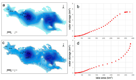 Lake area-water storage relationship can be established according to underwater topography derived from in situ bathymetric data (Figure 4a and Figure 5a). The lake area of HL was greater than 350 km2, lake water storage increased little with increasing lake area, and lake depth also increased little. The increasing rate of water storage in the lake area greater than 350 km2 was far less than that in the lake area 200−300 km2. Lake area had increased by 67 km2 from 2003 (311 km2) to 2018 (378 km2) based on Landsat images. The water level and water storage just increased by 1.15 m (0.077 m/y) and 0.39 km3 (0.026 km3/y) based on underwater topography from bathymetric data. Water storage of LL also increased little with increasing lake area in the lake area larger than 250 km2. Lake area of LL had increased by 49 km2 from 2003 (238 km2) to 2018 (287 km2) based on Landsat images, and water level and water storage just increased by 2.34 m (0.156 m/y) and 0.59 km3 (0.039 km3/y) based on underwater topography from in situ bathymetric data, respectively.