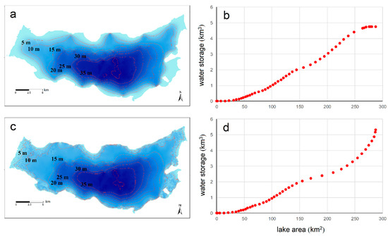Accuracy comparison of underwater topography from two methods in HL. (a), underwater topography based on bathymetric data; (b), the relationship between lake area and water storage based on bathymetric data; (c), underwater topography based on bathymetric data and SRTM; (d), the relationship between lake area and water storage based on bathymetric data and SRTM.