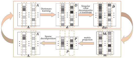 As shown in Figure 2, in order to ensure that more principal components of high-dimensional dictionary D are retained in the low-dimensional dictionary P. In TIPML, the singular value ʘ transformation is first used to make the energy of the dictionary D more concentrated. Next, the sparse representation coefficient A of the training data under the low-dimensional dictionary P is used to train the high-dimensional dictionary D. In this step, the low-dimensional dictionary P is used to train the high-dimensional dictionary D, which further increases the coupling between the two dictionaries and lets the principal components of the high-dimensional dictionary D be more retained in the low-dimensional dictionary P.