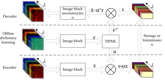 As shown in Figure 3, the simulation experiment mainly included three stages, namely offline learning, data sampling (encoding), and data reconstruction (decoding). In the experiment, the data of the Indian Pine data set was divided into two parts: The training data set and the test data set. The transformation adjustment parameters of the TIPML algorithm were set to ‘t = 255′ and ‘r = 0.3′. In addition, the data set was processed in blocks with a block size of 16 × 16, and each small block was arranged into a column vector with a size of 256 × 1. First, the training set Z was used as the TIPML training sample to obtain the projection matrix U. Then, the projection matrix U was used as a reduced-dimensional sampling matrix of the test data X to obtain the observation data Y. Finally, the transposed UT of the projection matrix was used to back-project the low-dimensional sampling data Y to obtain the reconstructed data.