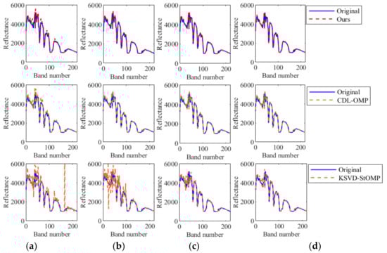 The original and reconstructed spectral lines of the pixel at coordinates (256, 1). From top to bottom, they are TIPML algorithm, CDL-OMP, and KSVD-StOMP. From the first column to the fourth column (a) The sampling rate SR = 0.1; (b) The sampling rate SR = 0.2;(c) The sampling rate SR = 0.3;(d) The sampling rate SR = 0.4.