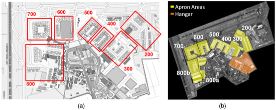 Site maps: (a) Apron areas defined in Aeroporti di Roma (ADR) official documents [34]. (b) Geocoded masks comprising the apron and hangar areas and superimposed to Pleiades image.