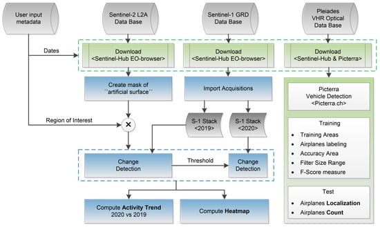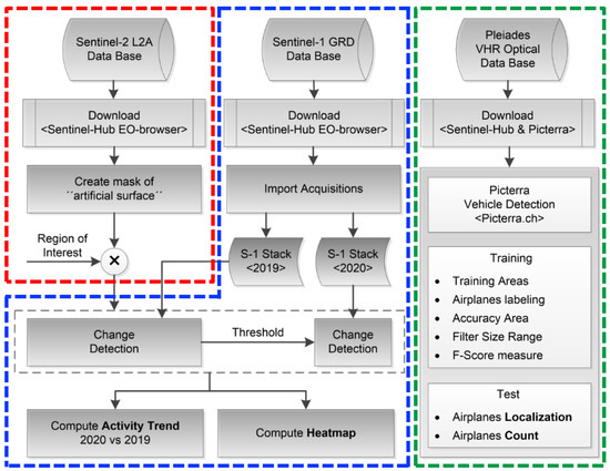 Flowchart of Figure 4 with superimposed three dashed polygons indicating the block diagrams for (Red) artificial surface mapping using S-2 data, (Blue) activity level determination using S-1 time series, and (Green) airplanes detection and localization on Pleiades acquisitions.