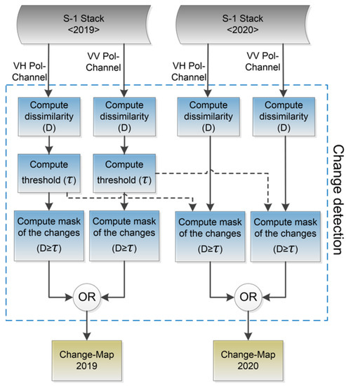 Figure 7 describes more in depth the change detection stage for the generation of the changeMap stack. In both the S-1 Stack 2019 and Stack 2020, we analyzed the change detection of only two consecutive images to preserve temporal resolution. A dissimilarity measure (D) based on speckle statistic is used for describing the changes in a scene. It is a statistical measurement used to define the dissimilarity between two SAR amplitude samples [40]: