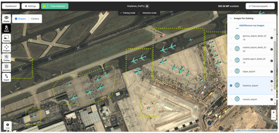 To extract a meaningful semantic result from the considered multi-temporal/multi-sensor data set provided by the Sentinel fleet, we exploited VHR optical images acquired by the Pleiades constellation. In particular, we built a deep learning (DL) model for detecting the airplanes in an airport. We exploited a set of Pleiades acquisitions, summarized in Table 3, to perform (1) training and validation of the DL model, and, eventually, (2) a test of the airplane detector over Fiumicino airport. Among Pleiades’ different products, we considered the true-color pan-sharpened image with a nominal resolution of 50 cm [35]. Figure 3 shows the dedicated Pleiades acquisitions used for building up the airplane detector. We employed them to train the deep learning model by excluding those areas within the red box used to validate the model itself. For this purpose, we downloaded all the available Pleiades acquisitions over airports from the Sentinel-Hub EO Browser.