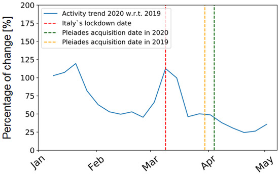 - Activity Trend: a plot showing the relative changes (in percentage) for the year 2020 with respect to 2019. It is computed as the ratio between the two temporal trends:A percentage lower than 100% indicates higher activity in 2019, otherwise an exceed over the 100% points out the presence of more changes in 2020 than in 2019. In this work, we consider as a temporal trend, the evolution of the average of the change-map at each time instant.