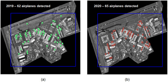 As mentioned in Section 2.4, we used Pleiades data for detecting airplanes in different areas of the Fiumicino airport and on different time-frames. This analysis allows for counting the number of aircraft in a given airport area, enabling the generation of results with a higher semantic. The dashed green rectangle in Figure 6 shows the methodology adopted for the extraction of two critical variables: the localization and count of airplanes within the airport, respectively.