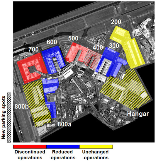 Post-lockdown detected operations for critical airport areas. Areas usage are identified as discontinued operations (red), reduced operations (blue) unchanged operations (yellow), and new parking spots (with stripes).
