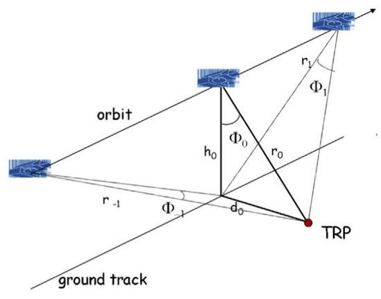 where d0 is the distance from the closest point of the ground track to the transponder position, r(t) is the distance from the transponder location to the satellite burst locations, and is the across track angle (angle between line from the satellite to the transponder position and the nadir direction).