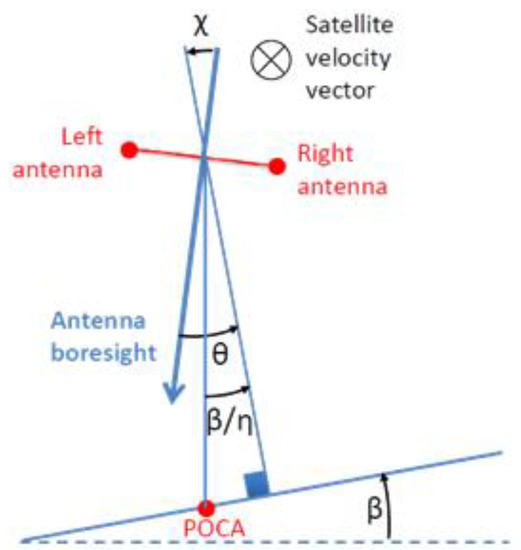 During interferometer calibration campaigns, the purpose of the CryoSat-2 interferometer is to estimate the across-track slope of the ocean surface [4], so that the end-to-end error on the angle of arrival is assessed by comparison of the measured across-track slope with an a-priori known across-track slope. The acquisition geometry is represented in Figure 2. We denote the roll angle as , the across-track slope of the ocean surface as β and the angle made by the direction of first arrival (i.e., Point of Closest Approach, POCA) with antennas′ boresight direction as . It is worth recalling that the interferometer baseline is defined as the vector following the direction between antenna 1 (the transmitting/receiving antenna, left one in Figure 2) and antenna 2 phase centers (the receiving only antenna, right one in Figure 2). Since the interferometer baseline is kept in flight orthogonal to the ground track, the orientation of the interferometer baseline in the across-track plane corresponds to the roll angle . According to the acquisition geometry in Figure 2, the across-track slope of the ocean surface results in