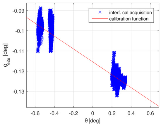 From an operative point of view, the inputs of the interferometer calibration tool are the Level 1b products for the acquisitions commanded during campaigns for the calibration of the CryoSat-2 interferometer. The 20 Hz power waveform is retracked to identify the POCA, and the angle of arrival is computed. Then, according to Equation (5), the error in the angle of arrival is obtained by knowledge of the roll mispointing angle and the ocean surface slope from the geoid. Finally, the parameters for the calibration function for the CryoSat-2 interferometer are obtained by linear regression, as depicted in Figure 3, where the end-to-end error in the angle of arrival for calibration campaign #3 as a function of the angle of arrival and the corresponding calibration function are depicted.