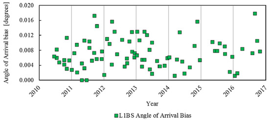 Results for the Angle of Arrival for each Transponder pass are shown in Figure 4. The overall 0.0071 degrees of bias is equivalent to a displacement in the geolocations across-track of about 87 m, and the standard deviation of 0.0040 degrees denotes an uncertainty of around 50 m. The results are slightly within the 0.0083 degrees of AoA requirement.