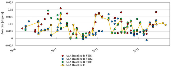 By averaging all the different errors, the AoA bias is 0.0071 degrees, bearing in mind that for each pass, different Star Trackers (STRs) with different temperature conditions have been used. The AoA pass-to-pass results variations depend mainly on the error of the estimation of the roll and are different for each STR, even if they should measure the same. So, for a single transponder pass, different AoA results can be obtained depending on which STR is used to retrieve the attitude. In the Baseline-C processor, a specific module, called an STR processor, is in charge of estimating the attitude [9]. The STR selection method was improved from Baseline-B. The previous method just selected the first available STR, while in Baseline-C, the selected STR is the one used by the Attitude and Orbital Control Systems. Additionally, the STR processor performs smoothing on the roll, pitch and yaw before writing them on the product. Although these changes improve the attitude measurements, the STR selection on board sometimes does not use the STR with the smallest error. A comparison between the AoA results from both baselines is shown in Figure 5. It can be seen that some Baseline-C results are worse than the ones available from Baseline-B. Further studies concluded with the need to implement an improved attitude solution in the Star Tracker processor (currently operational in Baseline-D products).
