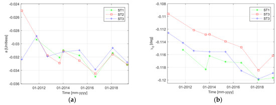 In Figure 6, we plotted the calibration function parameters that were obtained for the different interferometer calibration campaigns and for each available Star Tracker by processing Baseline-C L1b products. By inspection of Figure 6a, where the linear coefficient for the interferometer calibration function is reported, it can be noticed that similar values are obtained from the available Star Trackers for each campaign. This behavior was expected since the parameter a is a function of sea surface roughness only. By inspection of Figure 6b, where the estimated roll bias is reported, it can be noticed that exhibits a dependence on the Star Tracker. This suggests that a different roll bias is present depending on the rotation between each Star Tracker frame and the interferometer baseline. Additionally, a decreasing trend can be observed, at least up to 2018.