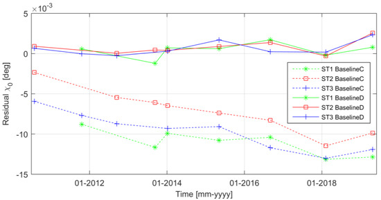 As an outcome of the roll calibration exploiting the interferometer calibration campaign over ocean, we decided to apply a different roll bias as function of the Star Tracker and variable as a function of the mission lifetime for the reprocessed products in Baseline-D [20]. By processing Baseline-D products from the interferometer calibration campaigns, the residual roll bias for each Star Tracker shown in Figure 7 was obtained. By inspection of Figure 7, it can be noticed that the residual roll bias in Baseline-D is steadily around zero, independently of the Star Tracker and of the campaign, resulting in an average roll bias of 0.0006 degrees with a standard deviation of 0.0009 degrees.