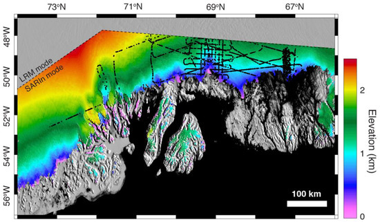 Location of the collocated swath-OIB (Operation Ice Bridge) measurements. EOLIS (Elevation Over Land Ice from Swath) DEM along the west coast of the Greenland Ice Sheet overlaid over the MEaSUREs MODIS (Moderate Resolution Imaging Spectroradiometer) Mosaic of Greenland [23]. The inland limit of the DEM corresponds to the CryoSat-2′s SARIn mode mask (dashed line); elsewhere the ice mask is in accordance with the Greenland Ice Mapping Project (GIMP) dataset [24]. Ice Bridge elevation acquired in March, April and May 2011 (black). Figure taken from [12].
