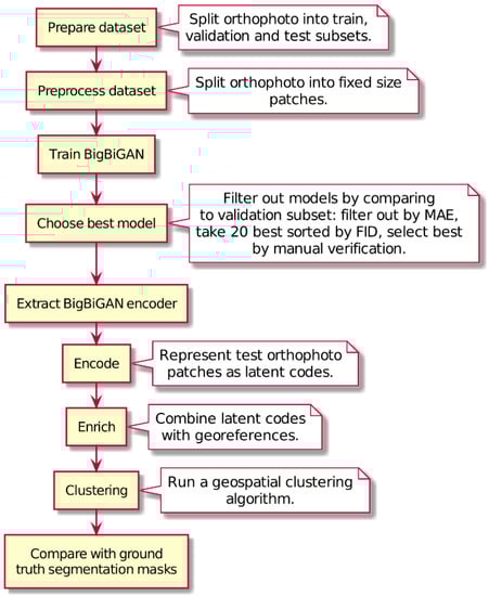 Figure 1 presents an overview of the proposed procedure composed of the following steps: preparing an orthophoto patches dataset, training the big bidirectional generative adversarial network (BigBiGAN), utilizing the network encoding module to convert orthophoto patches to their latent codes, enriching the data with geographical coordinates, and performing geospatial clustering on enriched latent codes.