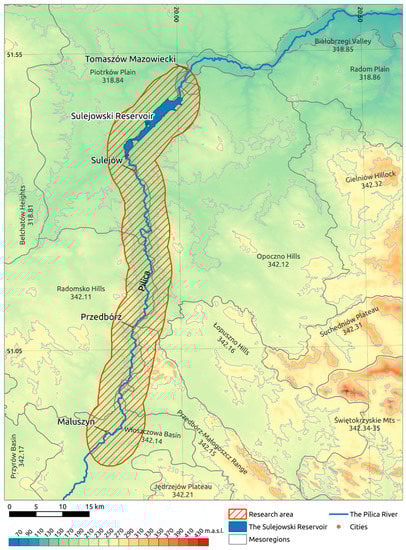 According to the physico-geographical regionalization of Poland [], the southern and eastern parts of the area are located in the province of Polish Uplands, the macroregion of the Przedbórz Upland, the mesoregions of Włoszczowa Basin, Radomsko Hills, Przedbórz-Małogoszcz Range, and Opoczno Hills. The northwestern part is located in the mesoregions of the Piotrków Plain and the Białobrzegi Valley, which are part of the South Mazovian Hills macroregion in the Central European Lowland Province. The consequence of the location in the border zone of the Polish Uplands and the Central European Lowland is the interpenetration of features characteristic of both provinces and the relative diversification of the natural environment of the area.