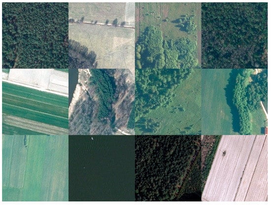Examples of the Pilica River region dataset samples (512 px × 512 px patches). From the upper left corner: forest and a barely visible forest path outline, farmlands cut by a sandy road planted with trees, forest with an adjacent land abandonment, forest, farmlands, river valley, forest and an overgrown meadow, forest with clearly outlined shadow and a dirt road, farmlands, water reservoir, forest cut by a road, recently plowed farmland with balks, and a young forest.