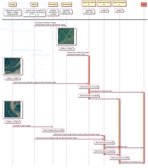 To avoid recreating an existing solution, the authors decided to focus on reusing the BigBiGAN design and adjusting it to processing orthophoto images (see Figure 4). BigBiGAN consists of five neural networks—a generator and an encoder, which are accompanied by discriminators that assess their performance in producing respectively artificial images and latent codes. Results from both intermediate discriminators are then combined by the main discriminator. In the research, a modification of BigBiGAN was utilized to tackle the problem of encoding orthophoto patches to the network underlying latent space. Although the generator and main discriminator architectures have been preserved, the encoder and intermediate discriminators went through a minor modification. As suggested in a study on the BigBiGAN [], the RevNet model was simplified to reduce the number of parameters needed to train the encoder. Intermediate discriminators contained fewer multilayer perceptron modules (MLP), which were composed of smaller numbers of neurons. In consequence, this enabled the use of slightly bigger batches and, therefore, yielded better results at the cost of a training time increase. The final architecture was implemented in TensorFlow 2 and Keras. Figure 4 presents the final model training sequence blueprint.