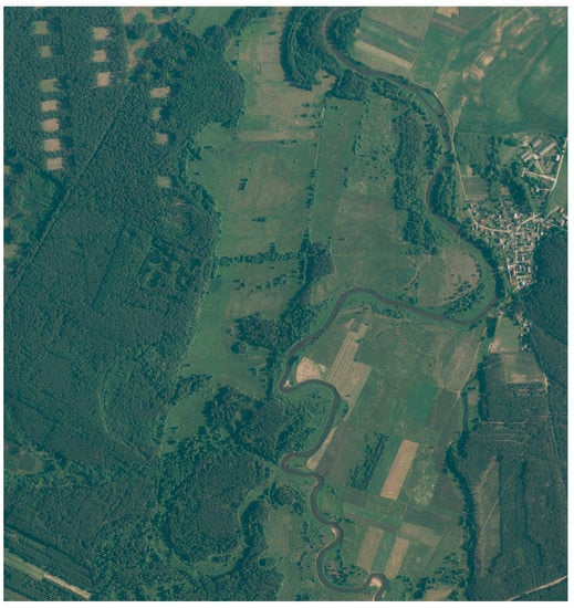 The Pilica River region dataset covers the area of 691.86 km2 and was generated using 138 orthophoto sheets that intersect with a 4 km buffer around the Pilica River from Sulejów to Maluszyn and Sulejowski Reservoir in Łódź Voivodeship in Poland. All orthophotos were acquired using GEOPORTAL2 [] and possess three channels—R-red, G-green, and B-blue with 25 cm pixel ground sample distance (see Figure 3).