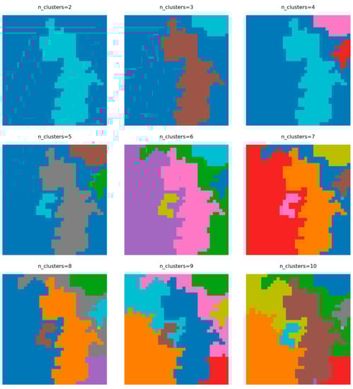 In the research, the authors utilized the trained encoder to perform inference on a set of 256 px × 256 px test patches (see Figure 7). The 1224 test patches were converted into their latent space codes and represented as a geopandas [] data frame containing 1224 rows, 120 encoding value columns, identifier, and a geometry column. Afterward, distance weights between patch centroids were calculated utilizing the k-NN algorithm []. The data frame and distance weights served as input parameters to the agglomerative clustering algorithm. Figure 8 represents the results for a specified number of clusters.