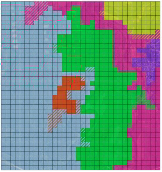 Clustering results of sample orthophoto (72961_840430_M-34-40-B-a-2-3 []) patches for fixed number of clusters (n clusters = 6). Each color represents a different cluster. Filled squares are the result of latent space clustering. The line pattern indicates the difference between the latent space clustering results and ground truth prepared by manual annotation.