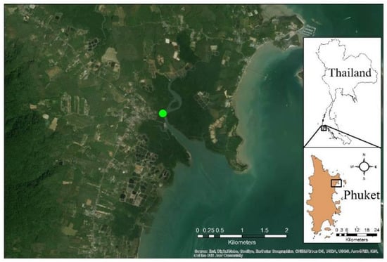 The study area is located in Bangrong Bay (8.052°N and 98.415°E), along the Andaman Sea in Phuket province, Southern Thailand (Figure 1). This site is the largest (~3 km2) remaining mangrove area in Phuket province, with Rhizophora apiculata as the dominant species. The cumulative annual rainfall is 2500 mm, with the wet season extending from May to November and the dry season from December to April. The mean annual temperature is 28 °C, with minimal seasonal temperature variation.