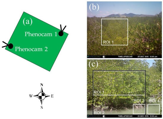 Fields of view and orientations of the two phenocams installed in the mangrove forest tower enclosure, which protected the phenocams. (a) The green square represents the top view of mangrove tower roof, with the viewing directions for (b) phenocam-1 (north facing) and (c) phenocam-2 (west facing) both showing the region of interest (ROI) of the mangrove forest area (ROI 1, white rectangle), as well as the combined mangrove–water canopy (ROI 2, black rectangle), the area where water level estimates were made (ROI 3), and the water background (ROI 4) from phenocam-2 only.