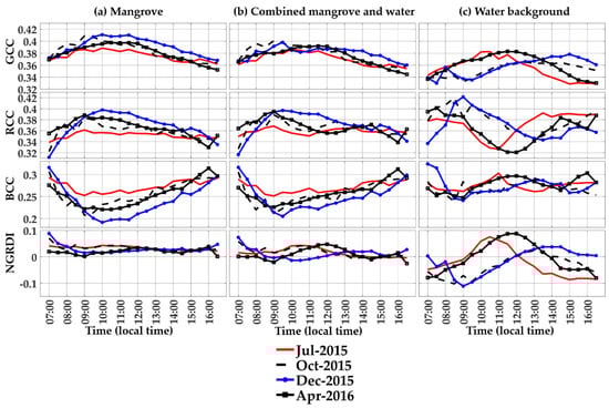 Diurnal variations of the phenocam-2 RGB color indices (GCC, RCC, BCC, and NGRDI) over 4 seasonal periods of the year for (a) the mangrove forest (ROI 1), (b) combined mangrove-water canopy (ROI 2), and (c) water background (ROI 4). The diurnal profiles were measured at 30-min intervals and 3-day averages for each seasonal period (14–16 July 2015; 18–20 October 2015; 29–31 December 2015; 7–9 April 2016). The local time was GMT + 07 h.