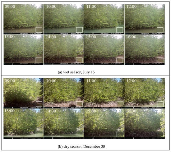 Mangrove phenology assessment based on digital repeat photography or phenocam imagery was analyzed in this study, with this approach found to have great potential for monitoring and evaluating mangrove phenology. The phenocams were able to extract reliable sub-daily, daily, and seasonal information about the status of the mangrove vegetation and below-canopy water properties, including the water color and relative water depth. The strong lunar tidal water periodicity was detectable with the phenocam color indices, both in the diurnal and seasonal profiles, and not only in the water ROI, but also in the mangrove–water canopy ROI profile and the mangrove forest ROI phenology profile.