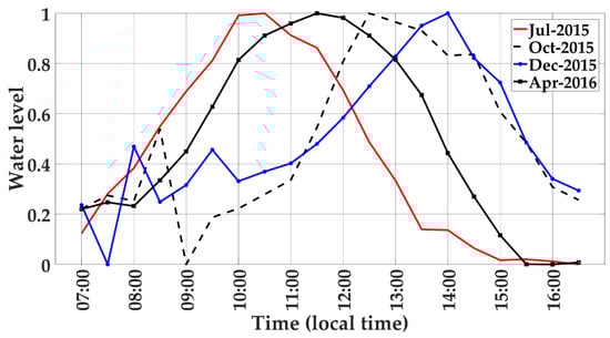 Normalized water level estimates for the diurnal tidal cycles for 4 seasonal periods, as determined from phenocam-2, ROI 3.