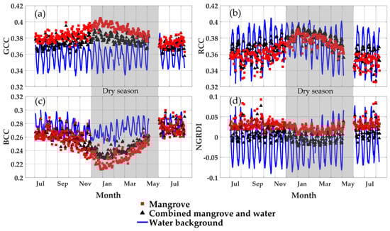 The phenocam-2 diurnal profiles, representing the mangrove forest, water background, and mangrove–water canopy ROIs (Figure 2), are shown in Figure 3 for the four RGB color indices and four seasonal periods of the year. The mangrove forest exhibited strong diurnal variation, with sharply increasing GCC values in the morning and peak values at mid-morning (10:00–11:00 h) (Figure 3a). The RCC profiles showed similar diurnal patterns as for GCC, while the BCC profiles were inversely related to those of GCC and RCC. The NGRDI profiles were relatively stable throughout the day and appeared to be the least affected by diurnal sun angle variations (Figure 3a).