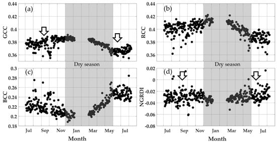 Various studies have also suggested that seasonal greenness measures of mangrove forests depend on leaf flushing and leaf development, as well as rates and periods of litter fall []. Pastor-Guzman et al. [] found that the litter fall of mangroves in southeast Mexico showed higher rates during the ends of both the dry and wet seasons, while other tropical mangrove studies in India have reported maximum litter fall during the pre- and post-monsoon periods [,]. In our study, we lacked information on litter fall and could not assess its influence in the interpretation of the GCC mangrove phenology profiles. In a terrestrial broadleaf deciduous study using phenocams [], the RCC index was found to be potentially useful for extracting leaf fall dates, because dried fallen leaves showed higher RCC values.