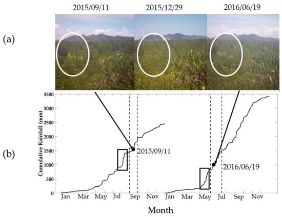 The timing of the appearance of new leaves as assessed by visual observation of phenocam-1 images. The new leaf growth was observed on 11 September 2015 and 19 June 2016. (a) The white circles in the top of the canopy images show the new leaf growth. (b) Plot of the cumulative rainfall from January to December for 2015 and 2016, with the dashed lines showing the time interval of the new mangrove leaf appearance. The two rectangles indicate the periods of rapid rainfall accumulation. Sprouting of new leaves occurs about 2 weeks after a major wet event.